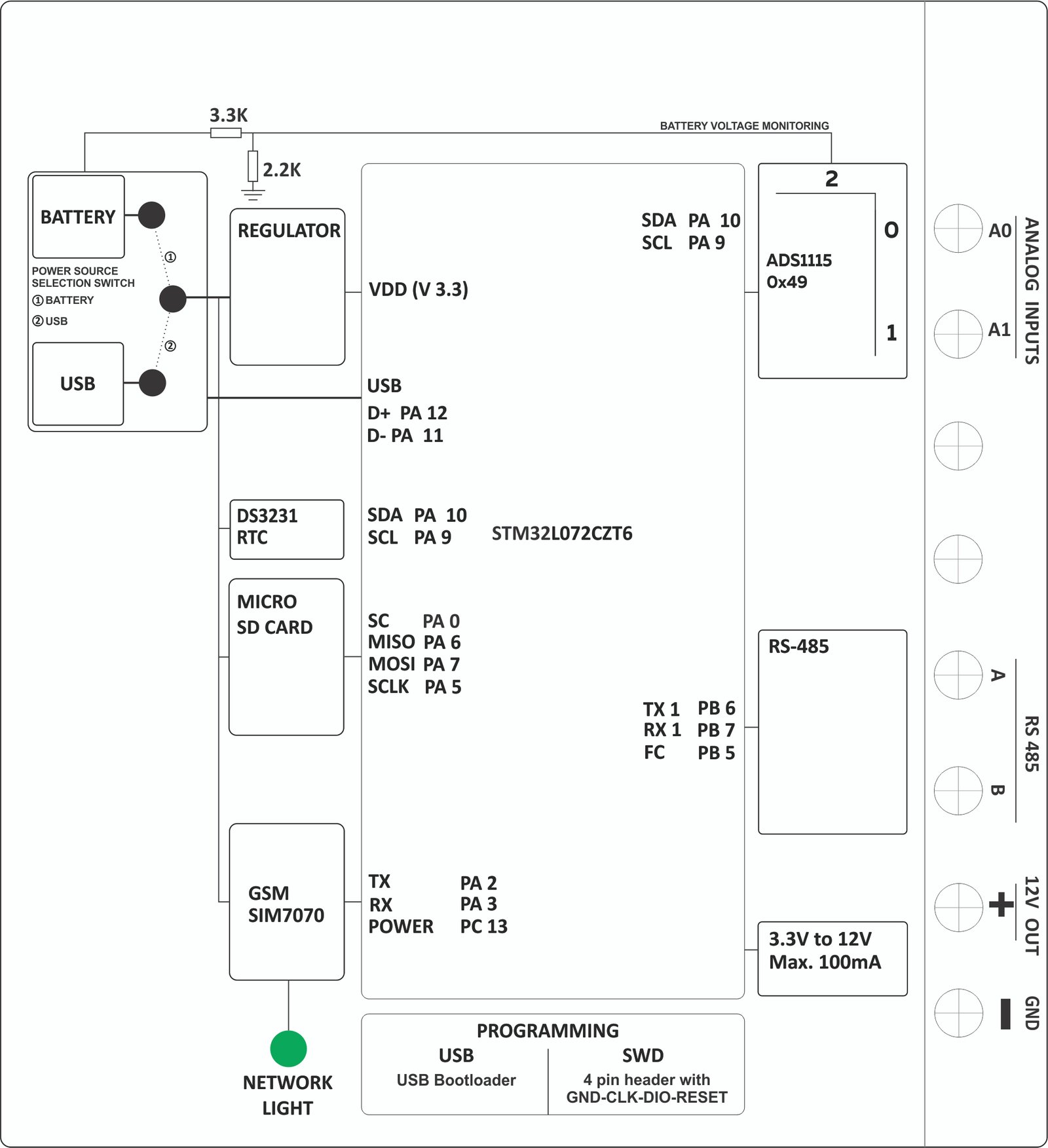 Dual 4-20mA analog inputs plus RS-485 interface for industrial sensor data acquisition and logging