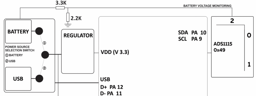 The battery is fed to the Port 2 of ADS1115 16 bit ADC, through a voltage divider as shown in the picture below. The battery voltage can be calculated and used for the operation and alerting functions.