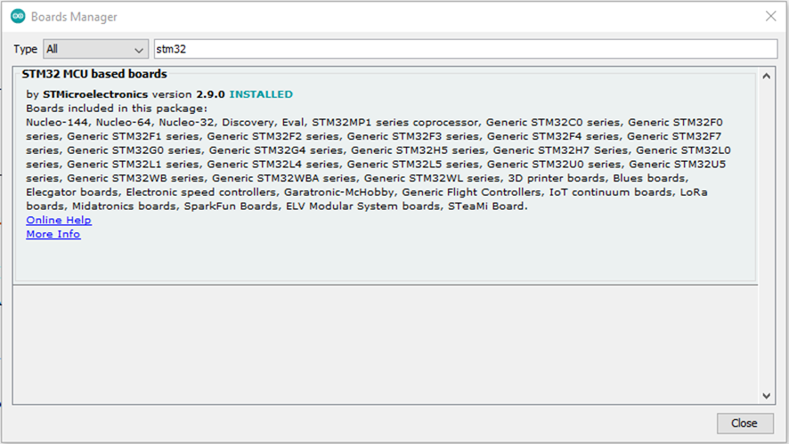 The boards package: STM32 MCU Based boards should be installed from the Arduino Boards Manager.