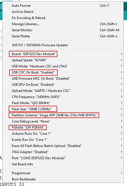 Once the installation is completed, select the correct board options for the “ESP32 Arduino” board. In the tools tab, on the board, choose “ESP32S3 Dev. Module”.