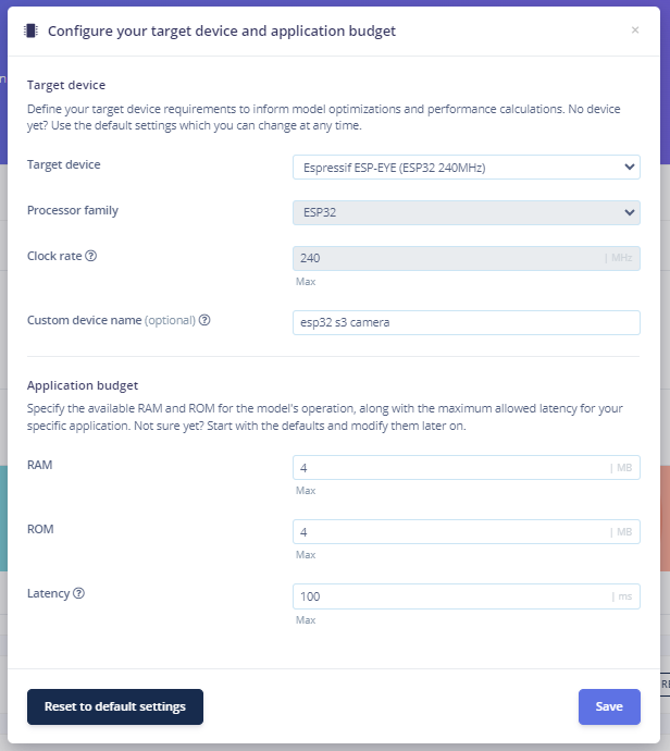 Enter your account credentials at Edge Impulse. Next, create a new project and select Espressif ESP-EYE (ESP32) as your target device.