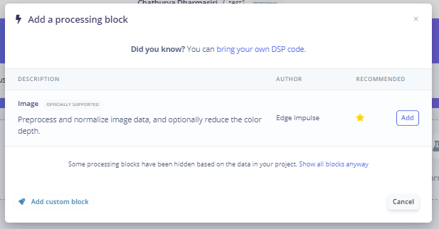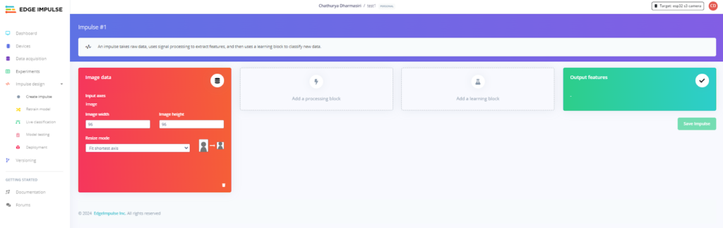 Go to the Impulse design tab and create an impulse with an image data block and image classification.