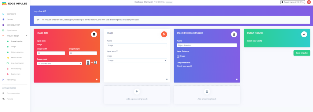 Configure the processing and learning blocks and save Impulse.