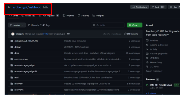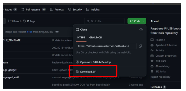 Second, clone the USB boot repository to the computer. Download the Raspberry Pi USB boot project from GitHub.
