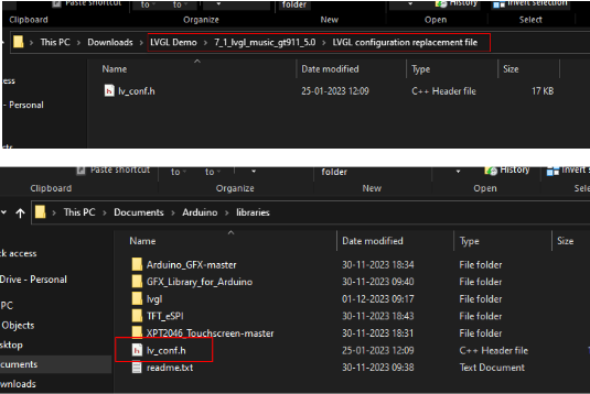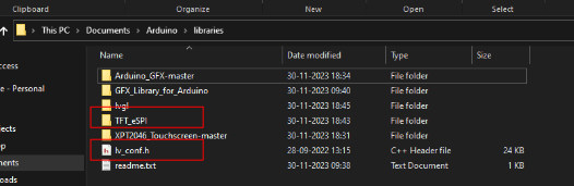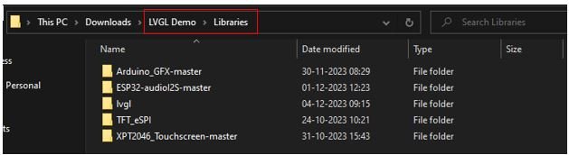 Copy the libraries from the downloaded LVGL Demo folder into the Arduino library folder.