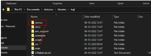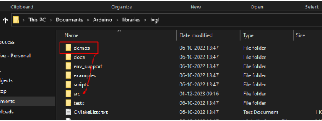 Copy the demos folder in the LVGL Demo/libraries/lvgl to the src folder in the LVGL Demo/libraries/lvgl/src.