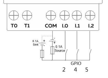 The digital inputs of NORVI AGENT 1-BT03-LTE can be configured as both sink and source connections. The inverse of the Digital Input polarity should be supplied to the common terminal.