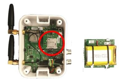 The SIM card should be inserted into the designated slot following the removal of the battery, as depicted in the provided image. Once the SIM card is properly inserted, reconnect the battery to the headers.
