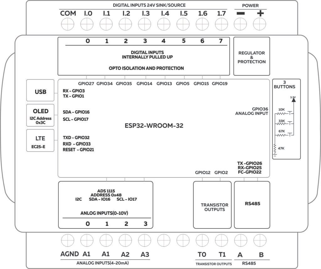 | Terminal Arrangement | Version 1 Digital Input 0 – GPIO39 Digital Input 1 – GPIO34 Digital Input 2 – GPIO14 Digital Input 3 – GPIO13 Digital Input 4 – GPIO4 Digital Input 5 – GPIO5 Digital Input 6 – GPIO15 | Version2 Digital Input 0 – GPIO27 Digital Input 1 – GPIO34 Digital Input 2 – GPIO35 Digital Input 3 – GPIO14 Digital Input 4 – GPIO13 Digital Input 5 – GPIO5 Digital Input 6 – GPIO15 Digital Input 7 – GPIO19 |