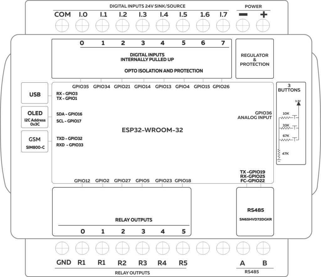| Terminal Arrangement | Digital Input 0 – GPIO35 Digital Input 1 – GPIO34 Digital Input 2 – GPIO21 Digital Input 3 – GPIO14 Digital Input 4 – GPIO13 Digital Input 5 – GPIO4 Digital Input 6 – GPIO15 Digital Input 7 – GPIO26 ![]() |