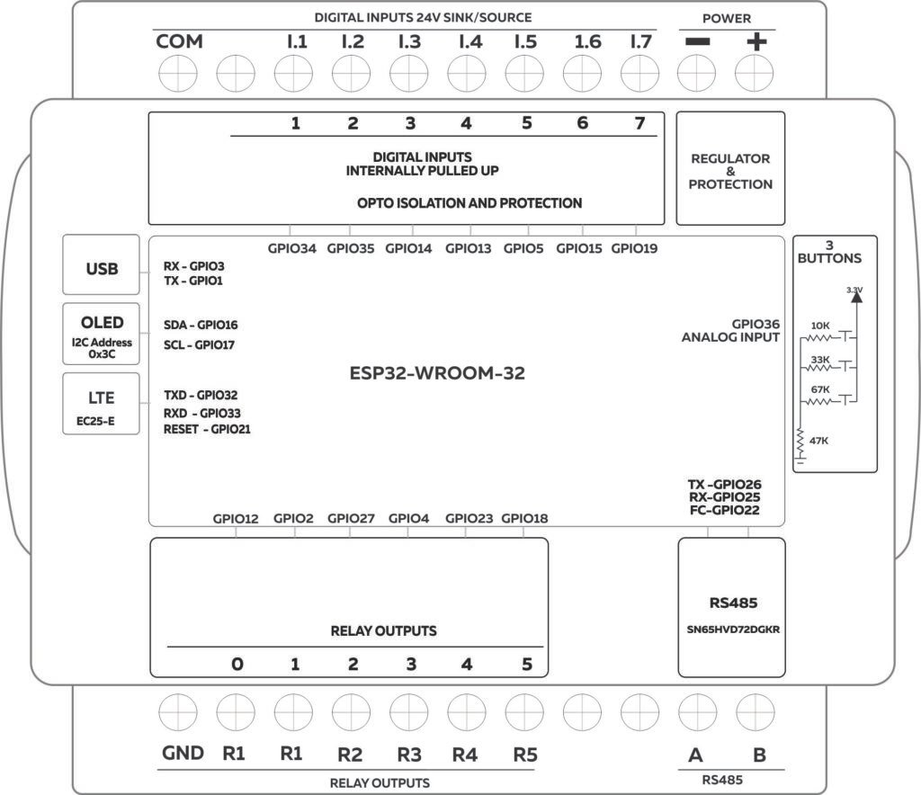 | Digital Input 0 – GPIO39 Digital Input 1 – GPIO34 Digital Input 2 – GPIO35 Digital Input 3 – GPIO14 Digital Input 4 – GPIO13 Digital Input 5 GPIO4 Digital Input 6 -GPIO15 Digital Input 7 – GPIO26 | Digital Input 1 – GPIO34 Digital Input 2 – GPIO35 Digital Input 3 – GPIO14 Digital Input 4 – GPIO13 Digital Input 5 – GPIO5 Digital Input 6 – GPIO15 Digital Input 7 – GPIO19 | |