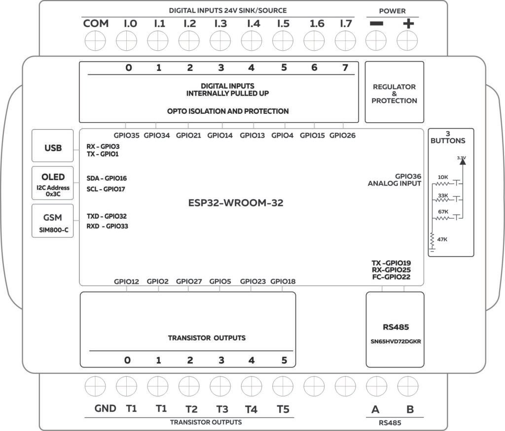| Terminal Arrangement | Digital Input 0 – GPIO35 Digital Input 1 – GPIO34 Digital Input 2 – GPIO21 Digital Input 3 – GPIO14 Digital Input 4 – GPIO13 Digital Input 5 – GPIO4 Digital Input 6 – GPIO15 Digital Input 7 – GPIO26 ![]() |