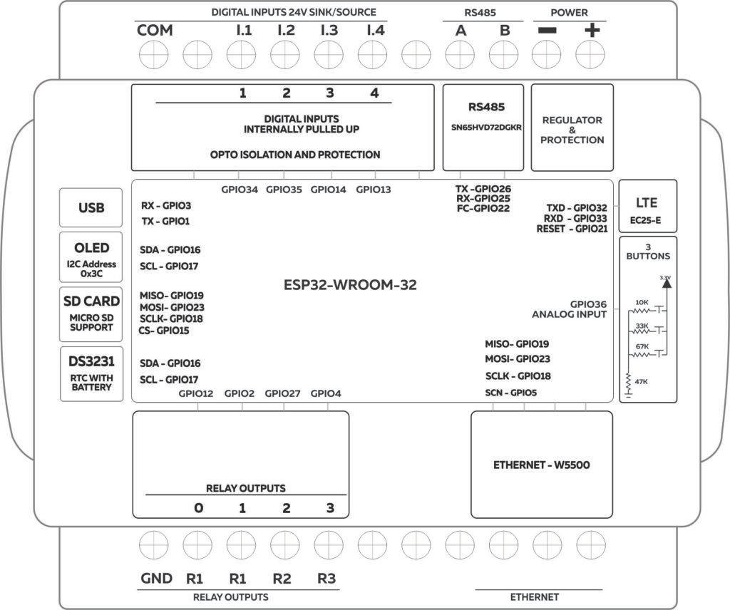 | Terminal Arrangement | Digital Input 1 – GPIO34 Digital Input 2 – GPIO35 Digital Input 3 – GPIO14 Digital Input 4 – GPIO13 ![]() |