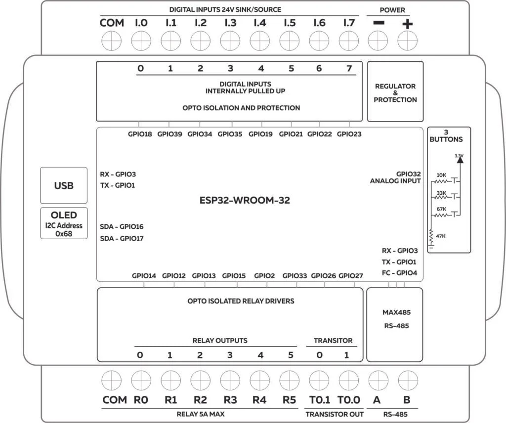 | Terminal Arrangement | Digital Input 0 – GPIO18 Digital Input 1 – GPIO39 Digital Input 2 – GPIO34 Digital Input 3 – GPIO35 Digital Input 4 – GPIO19 Digital Input 5 – GPIO21 Digital Input 6 – GPIO22 Digital Input 7 – GPIO23 ![]() |