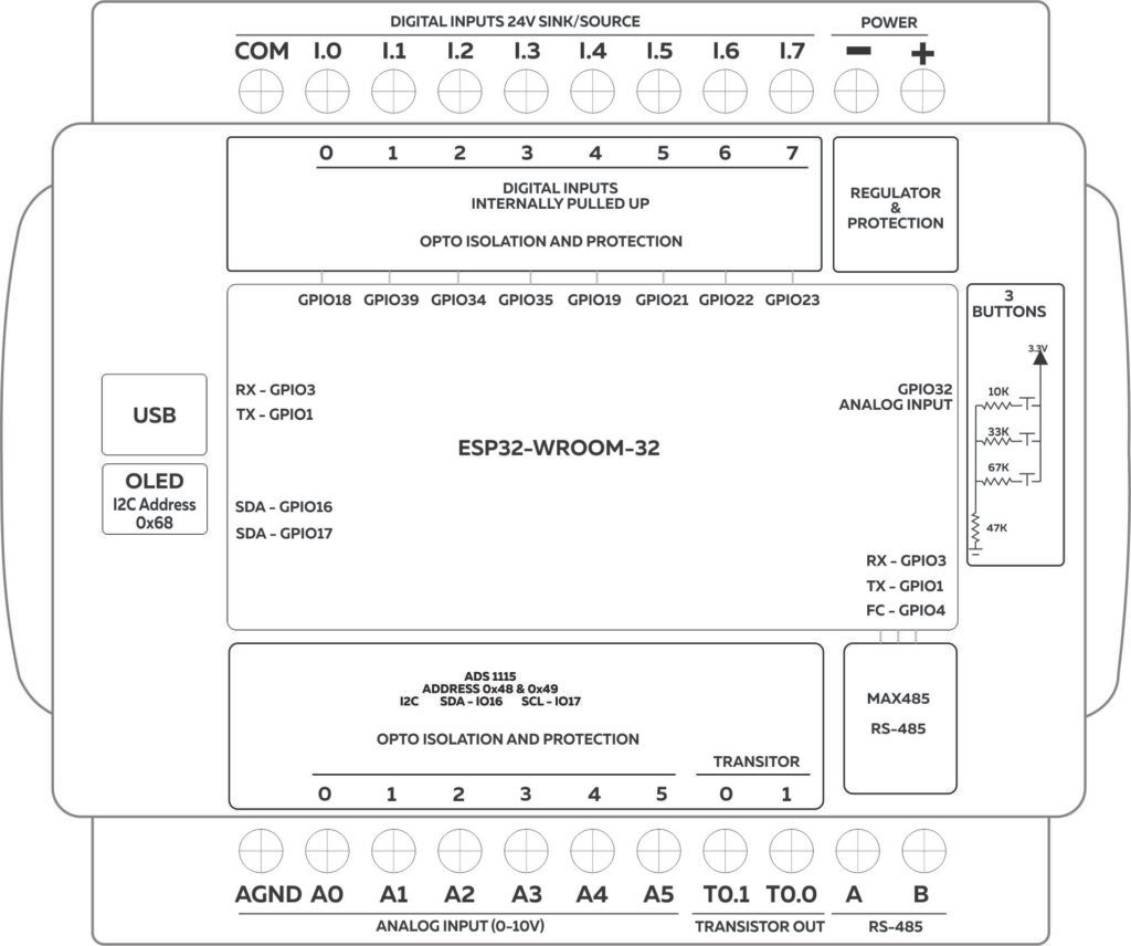 | Terminal Arrangement | Digital Input 0 – GPIO18 Digital Input 1 – GPIO39 Digital Input 2 – GPIO34 Digital Input 3 – GPIO35 Digital Input 4 – GPIO19 Digital Input 5 – GPIO21 Digital Input 6 – GPIO22 Digital Input 7 – GPIO23 ![]() |
