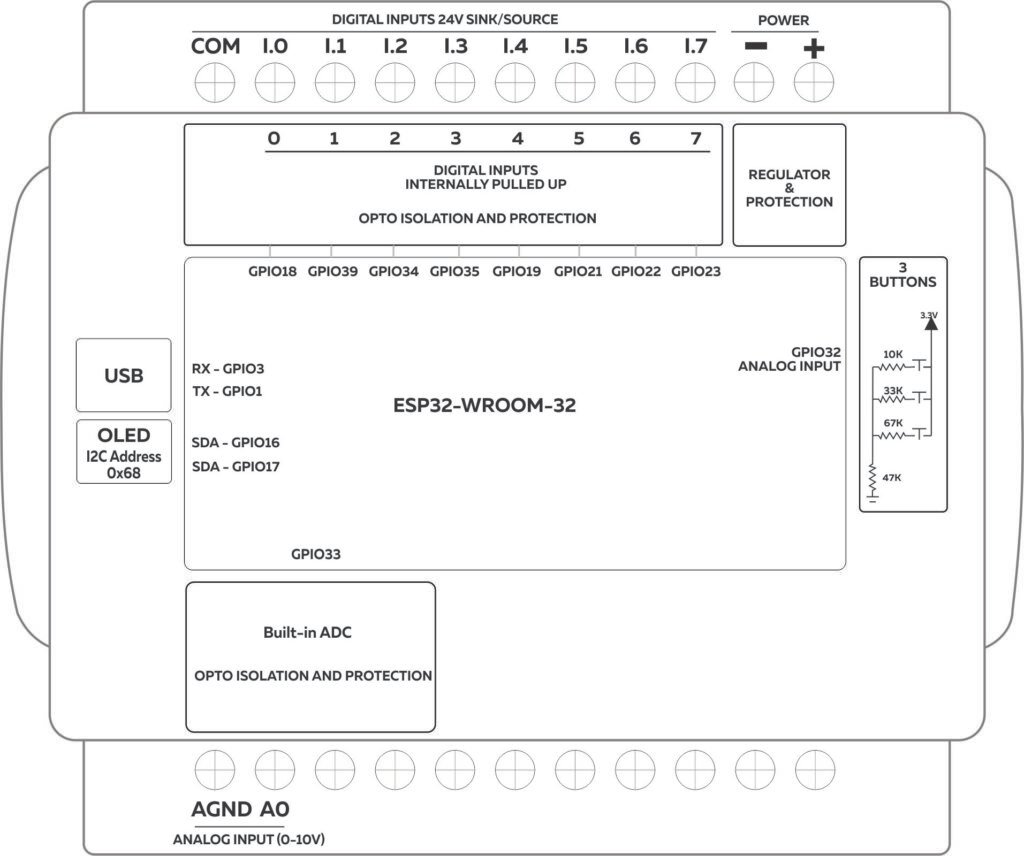 | Terminal Arrangement | Digital Input 0 – GPIO18 Digital Input 1 – GPIO39 Digital Input 2 – GPIO34 Digital Input 3 – GPIO35 Digital Input 4 – GPIO19 Digital Input 5 – GPIO21 Digital Input 6 – GPIO22 Digital Input 7 – GPIO23 ![]() |
