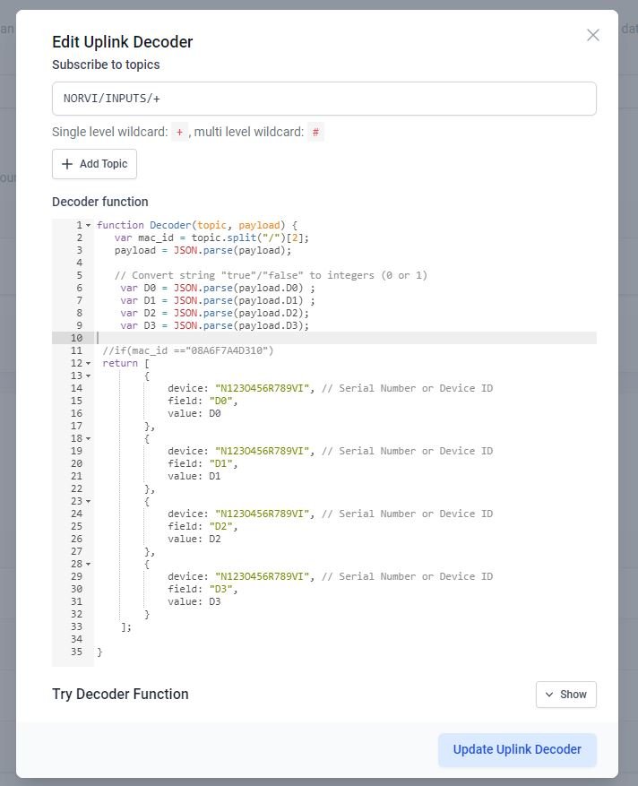 }“Try Decoder Function” allows the decoder function to be tested to verify its functionality before deploying it. By entering sample data and observing the output, you can verify that the decoder is correctly parsing incoming payloads and formatting the data in a way that can be sent to the Datacake API.