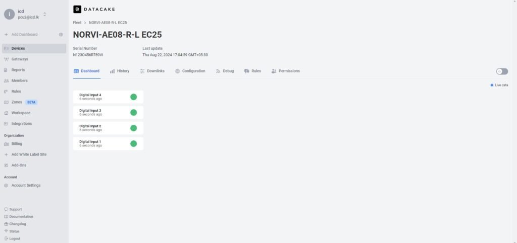 The NORVI Devices can be connected to an IoT platform, allowing users to visualize data collected by the NORVI devices. The platform used in this case is DATACAKE. Here’s how to integrate the NORVI devices with DATACAKE.