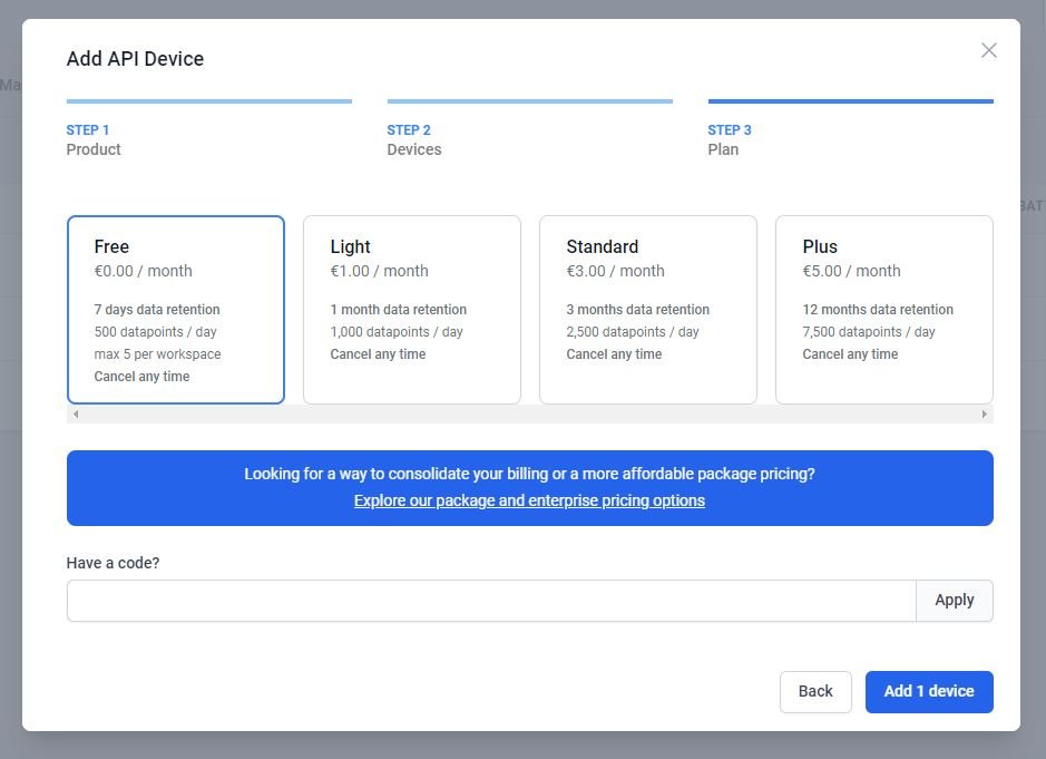 For the MQTT integration select the API. This will add the device to the Datacake account.