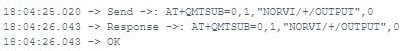 Subscribe to MQTT Topic( AT+QMTSUB=0,1,”NORVI/+/OUTPUT”,0)