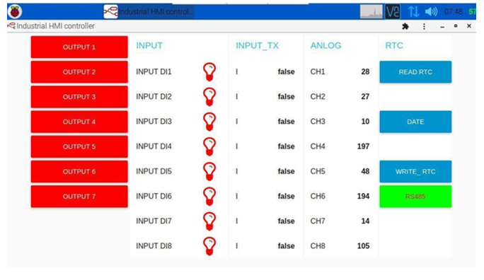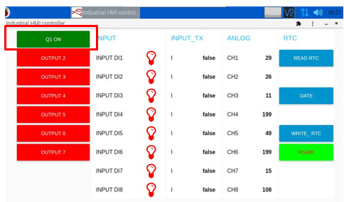After logging into the system, the displayed interface offers a quick summary of the Raspberry Pi HMI’s Input/output (I/O) status. This interface visually represents the real-time conditions of connected devices, such as sensors and actuators, providing a convenient overview for monitoring and control in an industrial or automation environment.