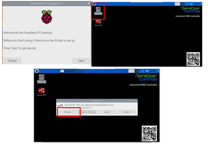 Once the power supply is connected and the boot source (micro SD card or external eMMC) is in place, the Raspberry Pi HMI turns on. The device will begin the boot sequence, and the startup process displayed on the integrated 7-inch touch panel or any connected external display via HDMI.