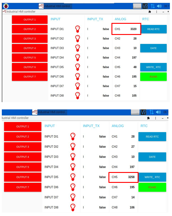 When analog inputs are connected, the system displays the corresponding high values for those inputs, as illustrated in the figures below.