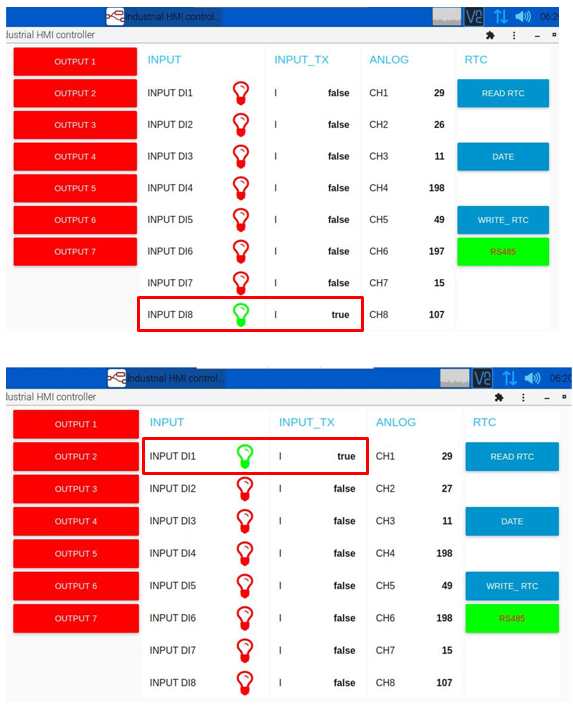 When digital inputs are connected, the system displays the corresponding high values for those inputs, as illustrated in the figures below.