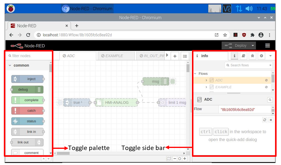 Once the Node-RED dashboard is displayed in the web browser tab, click the “>” symbol or press “CTRL + P” to reveal the Toggle Palette. Similarly, click the “<” symbol or press “CTRL + Space” to unveil the Toggle Side Bar, as illustrated in Figure 3.