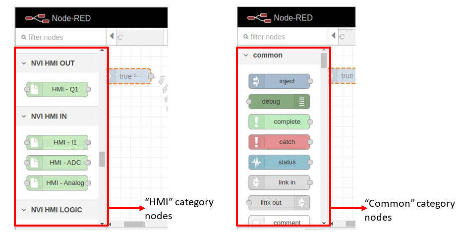 Navigate to the left “Toggle Palette” and scroll down to the “NVI HMI OUT” and “NVI HMI IN” categories. Nodes within these categories are utilized for programming industrial Panel controller modules. In addition, from the “common” category at the top of the “Toggle Palette,” find inputs, outputs, and debug nodes, as indicated in Figure 4. To modify node settings, double-click on the respective node.