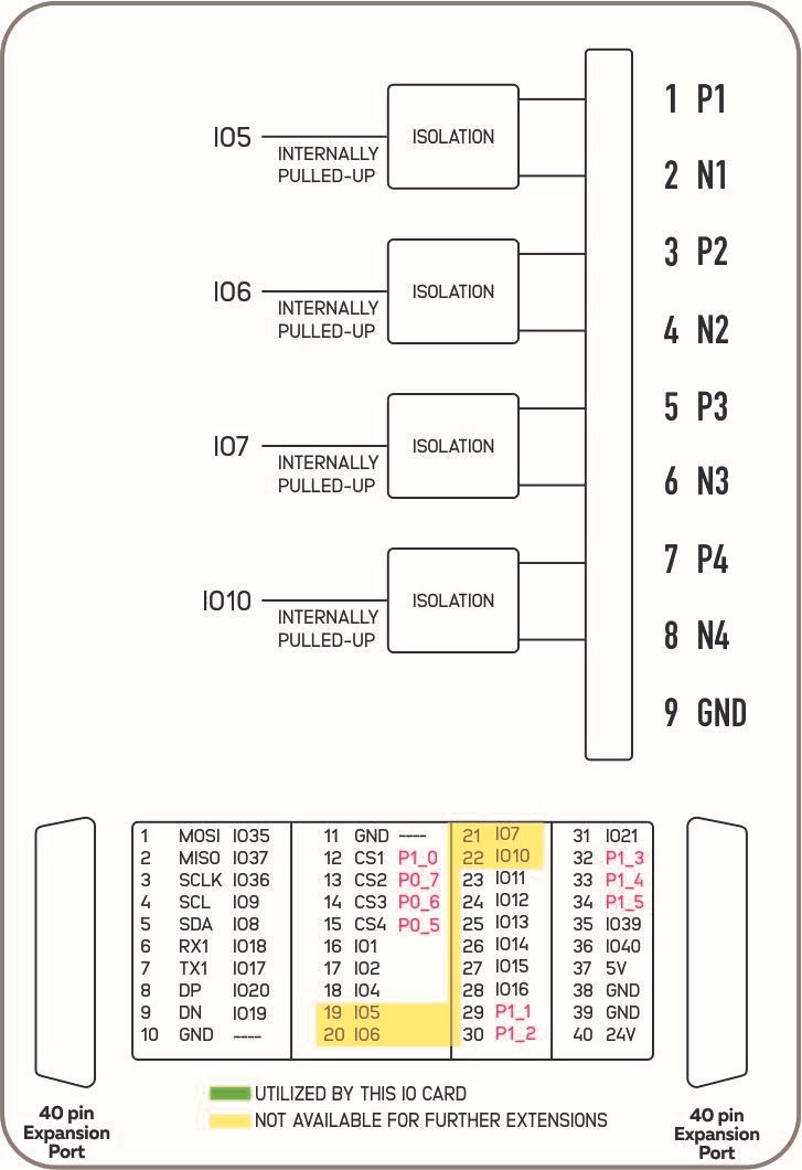 The DI4 variant directly connects its inputs to the host CPU’s GPIO, offering high-speed signal capture suitable for PWM, pulse-train, and encoder inputs. Its design ensures noise immunity, galvanic isolation, and compatibility with both sourcing (PNP) and sinking (NPN) sensor types.