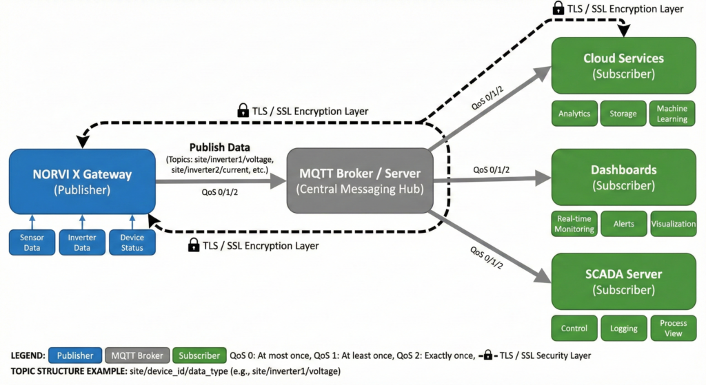 Real-time monitoring requires efficient data collection and transmission strategies. The NORVI X controller can query inverters at configurable intervals, typically ranging from 1 to 60 seconds depending on application requirements. Subsequently, the gateway aggregates data from multiple sources before transmission.