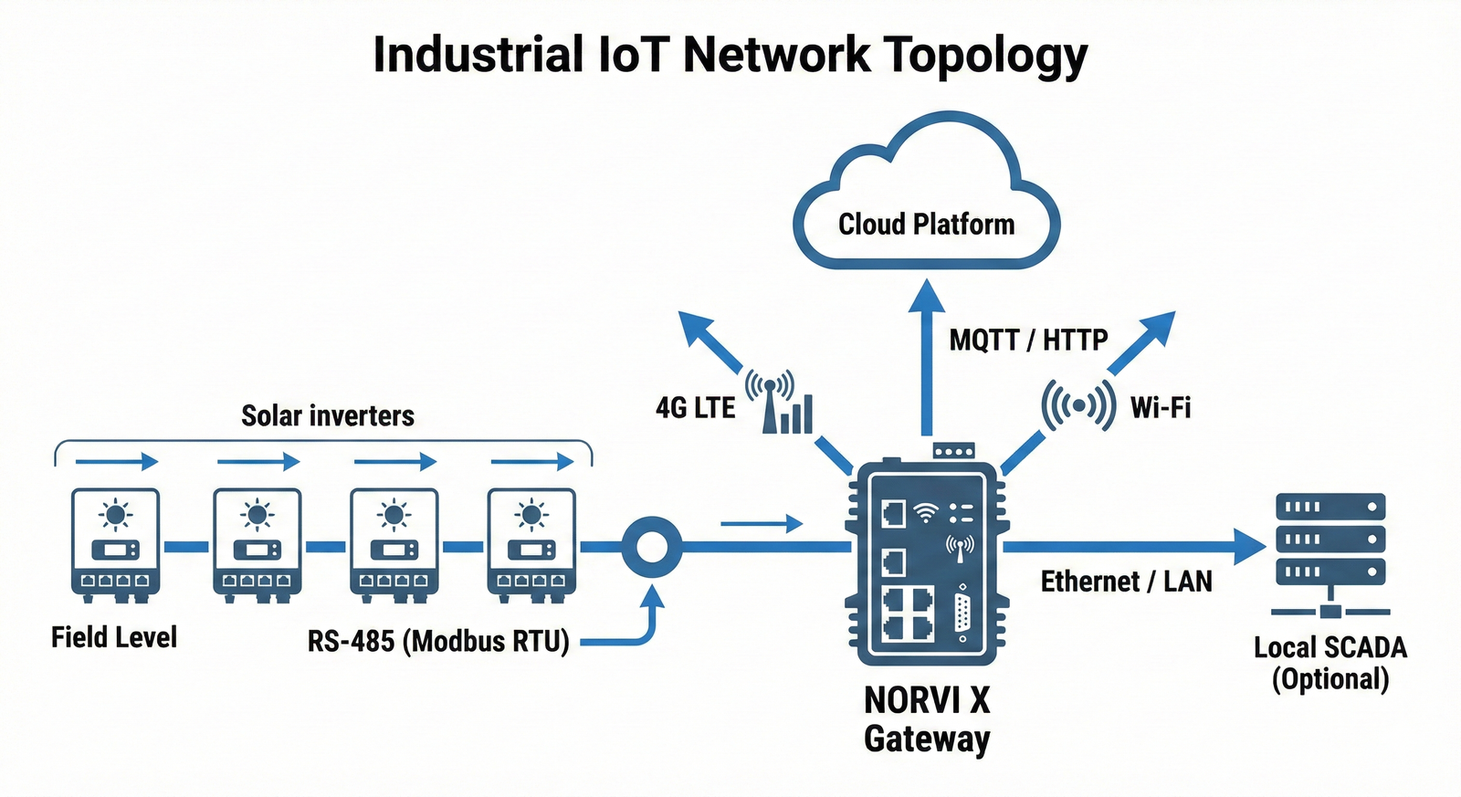 Most modern solar inverters communicate using Modbus protocols, making this the industry standard for real-time solar analytics. Modbus RTU operates over RS485 serial communication, while Modbus TCP utilizes Ethernet networks. Consequently, the NORVI X controller supports both variants, ensuring compatibility with diverse inverter manufacturers.